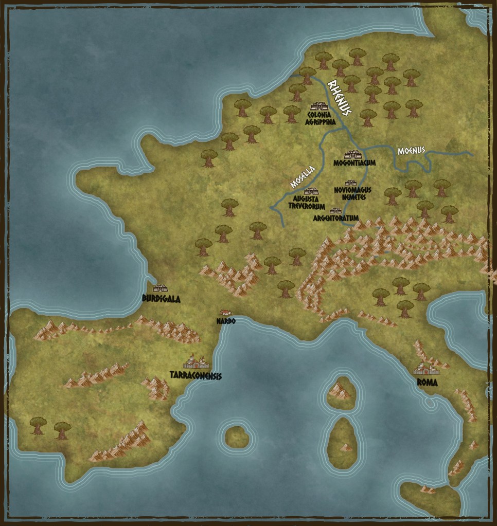 Ave, friends! Here is a preview of the map that will accompany Provincial Son to aid the reader in following our characters across Europe in 88 and 89 AD. From Hispania and Gallia to Germania, Trajan will march across the Empire to ensure it survives its latest test!